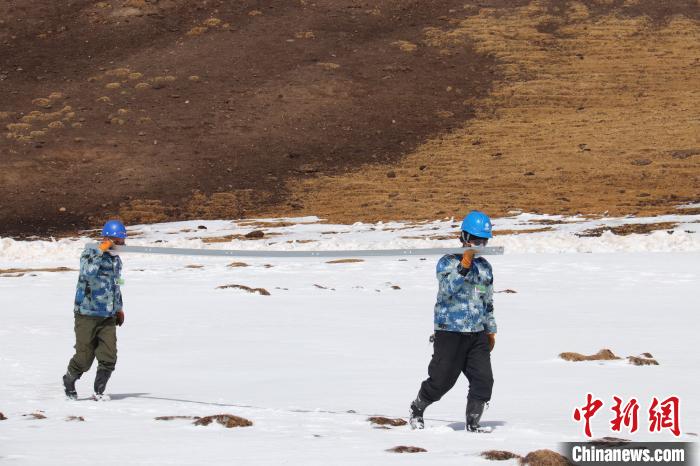青海省玉樹(shù)藏族自治州稱多縣境內(nèi)的覺(jué)頂山山頂海拔5310米,“三區(qū)兩州”玉樹(shù)地區(qū)電網(wǎng)工程建設(shè)稱多110千伏輸變電二回線路將在這里組立一基鐵塔。4月10日,天剛蒙蒙亮,項(xiàng)目負(fù)責(zé)人韓建青便帶著施工隊(duì)徒步趕向位于半山腰的塔基處。積雪已經(jīng)淹沒(méi)了腳踝,一腳踩下去,能清晰的感受到冰雪觸及皮膚帶來(lái)的刺痛?!耙氲竭_(dá)塔基處可不容易啊,看到我們背的鐵鍬了嗎,那不是挖地的,那是開(kāi)路用的?!蹦杲?0歲的韓建青氣喘吁吁地說(shuō)。