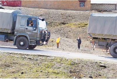 車隊(duì)行駛途中,沿線藏族兒童向軍車敬禮。干亞東 攝