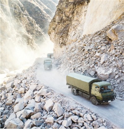 執(zhí)行任務(wù)時(shí)通過滾石區(qū)的車隊(duì)。沈奧 攝