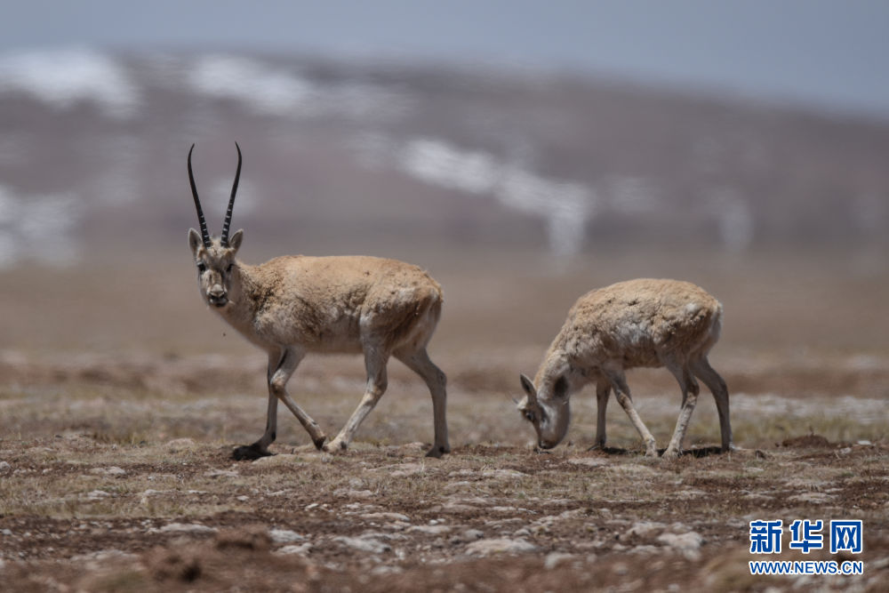 5月15日,兩只藏羚羊在可可西里地區(qū)活動。新華社記者 吳剛 攝