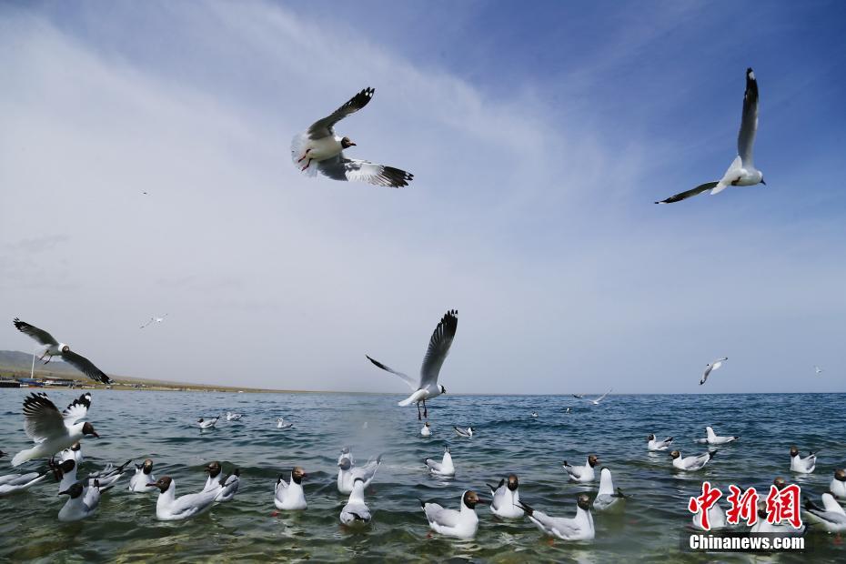 5月19日,水鳥在青海湖自由翱翔。初夏時(shí)節(jié),成群的魚鷗、斑頭雁等多種水鳥在青海省海南藏族自治州青海湖景區(qū)內(nèi)自由翱翔,嬉戲玩耍,吸引游客前來(lái)觀賞。中新社記者 馬銘言 攝