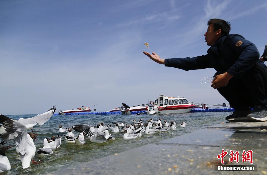 5月19日,一位游客在青海湖二郎劍景區(qū)內(nèi)給水鳥喂食。當(dāng)日是中國(guó)旅游日,游客在青海省海南藏族自治州青海湖二郎劍景區(qū)內(nèi)乘船觀湖、與水鳥互動(dòng)、感受初夏青海湖的海天一色之美。中新社記者 馬銘言 攝