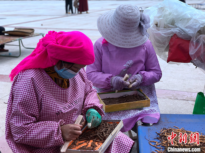 圖為6月13日,交易市場(chǎng)內(nèi)正在清刷蟲(chóng)草上泥土的刷草工。中新社記者 李江寧 攝