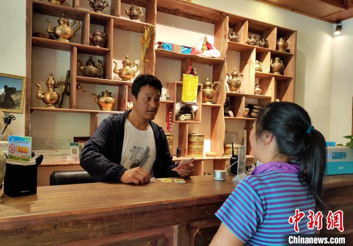 洛太在民宿前臺接待游客。王鵬 攝
