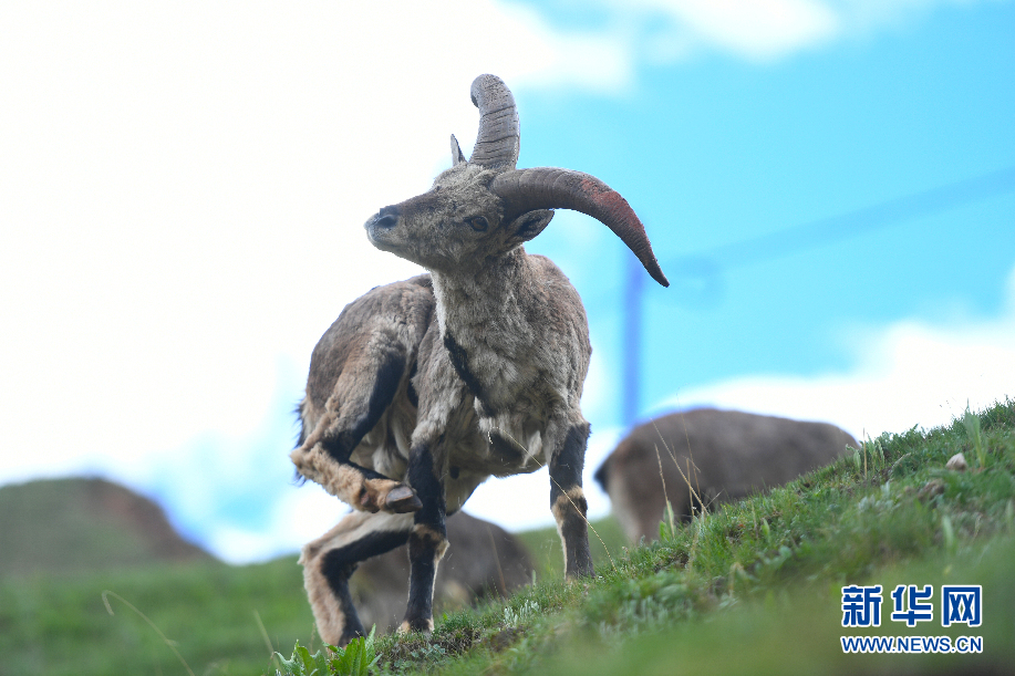 一只巖羊在囊謙縣吉尼賽鄉(xiāng)河谷的山坡上嬉戲。(6月20日攝)新華網(wǎng) 潘彬彬 攝