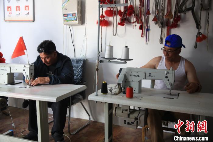 圖為日增(右一)和同事正在加工牛絨用品。胡貴龍 攝