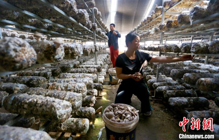 “香菇夫妻”王世芳和丈夫萬銀成正采摘香菇。高展 攝