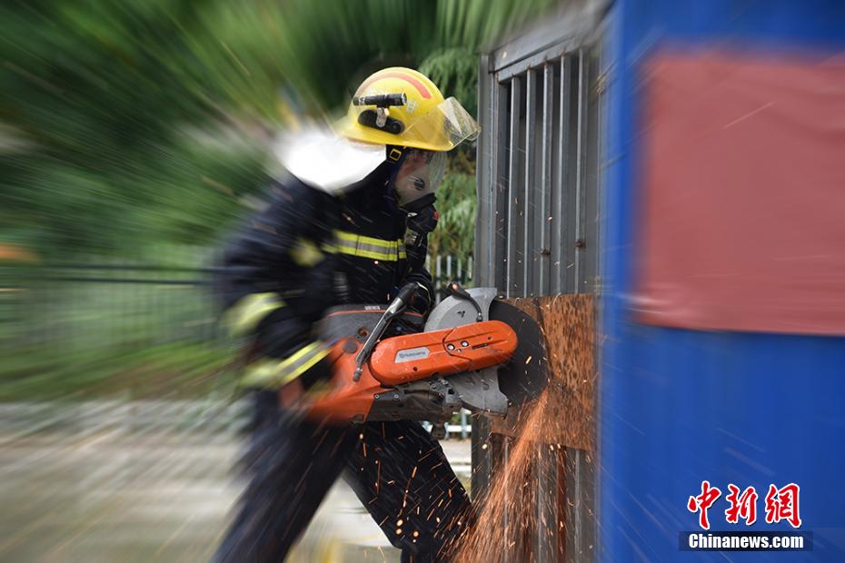 圖為消防員利用無(wú)齒鋸對(duì)障礙物進(jìn)行破拆。 婁淵燾 攝