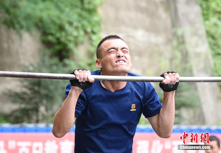 圖為消防員摩拳擦掌,迎難而戰(zhàn),創(chuàng)造了單杠卷身上的新紀(jì)錄。 婁淵燾 攝