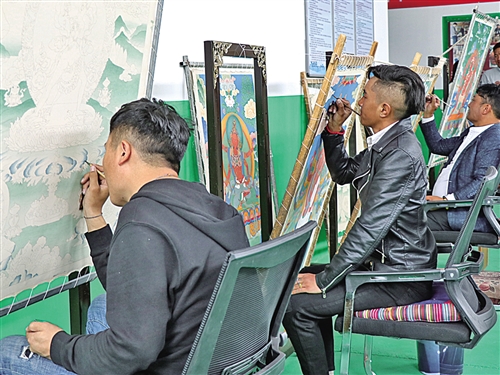 囊謙縣乃嘉瑪唐卡文化藝術(shù)有限公司里,在非遺傳承大師桑買的指導(dǎo)下,一批年輕的農(nóng)牧民唐卡繪畫藝人在成長,同時(shí)也拓寬了他們?cè)鍪罩赂坏那?。申維祖 攝