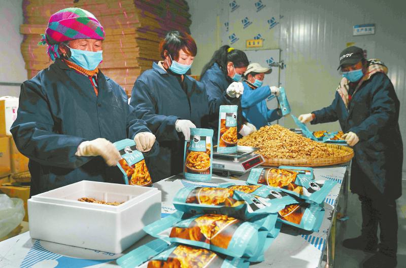 在涼山州木里縣藏祥閣農(nóng)特產(chǎn)品商貿(mào)有限公司,工人們正在熟練地為核桃裝袋。近年來,通過電商銷售,木里的農(nóng)特產(chǎn)品成為網(wǎng)上暢銷商品,既為農(nóng)民脫貧、增收開拓了新路,又滿足了現(xiàn)代人對農(nóng)村原生態(tài)農(nóng)產(chǎn)品的消費(fèi)需求。尹鋼 攝(資料圖片)