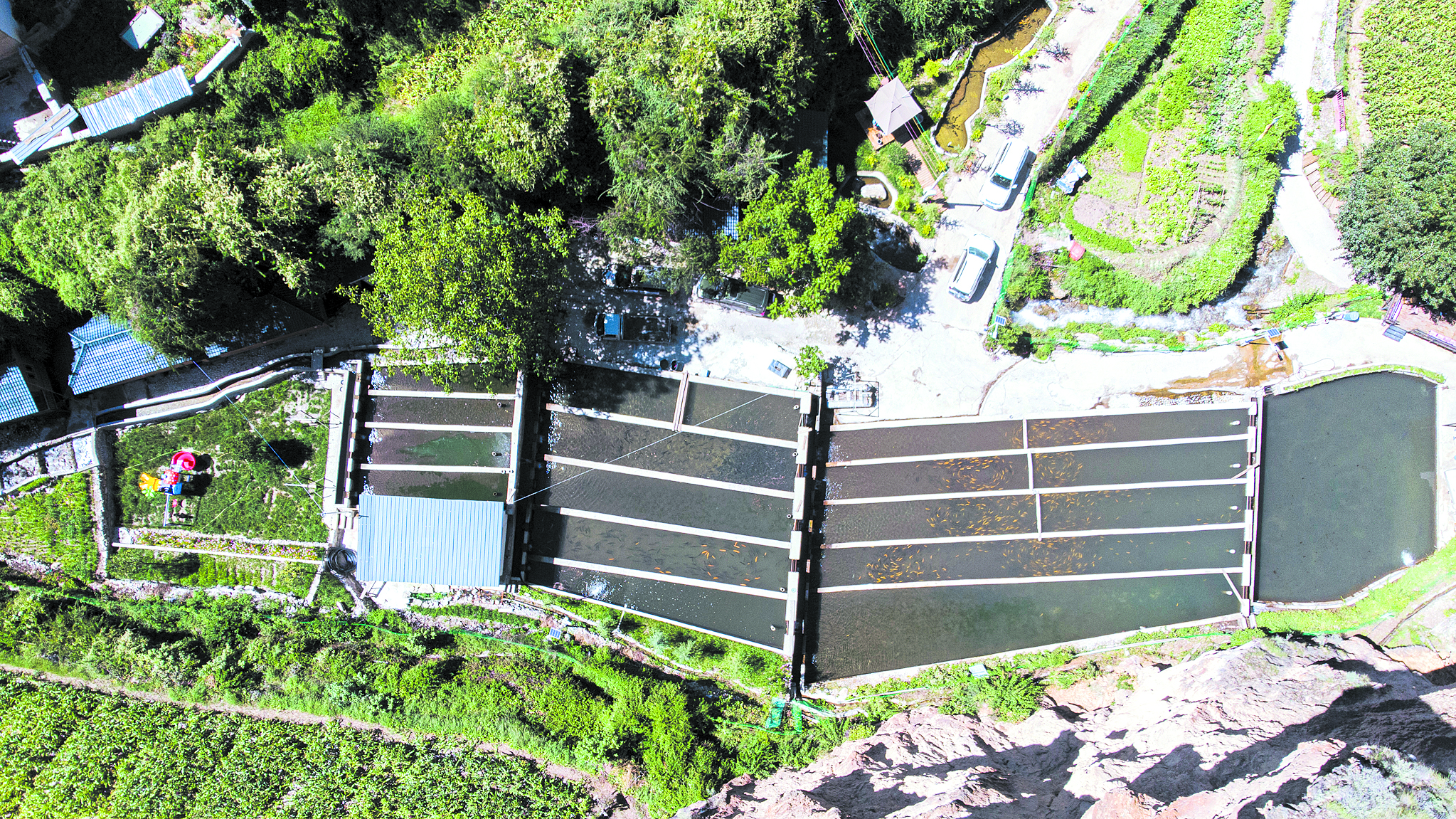 采訪車沿215國道在山谷間蜿蜒,定曲河水碧藍(lán)清亮。從莫木溝一路翻山而上,快到山頂時(shí),一座高山冷水魚養(yǎng)殖魚場(chǎng)呈現(xiàn)眼前。