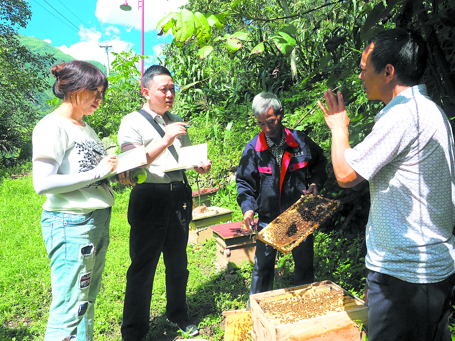 回轉(zhuǎn)身去,蒲江縣對口援助瀘定工作隊隊長吳孟賢正和張洪彬攀談著今年的蜜蜂增收情況?!捌呀h新增財政幫扶資金277萬元作為獎補資金,激勵成都三千米甜蜂業(yè)有限公司落戶瀘定發(fā)展的‘貢嘎中蜂’養(yǎng)殖支援項目,現(xiàn)在已經(jīng)累計發(fā)放貢嘎中蜂7500余群,幫助全縣38個貧困村發(fā)展村級集體經(jīng)濟,示范帶動800戶以上貧困戶增收?!眳敲腺t滔滔不絕如數(shù)家珍,身旁飛過的貢嘎中蜂也似乎成了他和其他對口支援隊員的化身,他們從舒適的成都平原來到高原瀘定,懷揣堅定的信念,用行動肩負起責(zé)任與擔(dān)當(dāng),他們將藏族同胞的利益裝在心里、舉過頭頂,排除千難萬險,因地制宜推動當(dāng)?shù)匕l(fā)展;跋山涉水,進居入戶,訪貧問苦,為藏族同胞送上溫暖與關(guān)懷……他們用心血和汗水書寫著一個大大的“愛”字,甜到藏族同胞的心坎上。