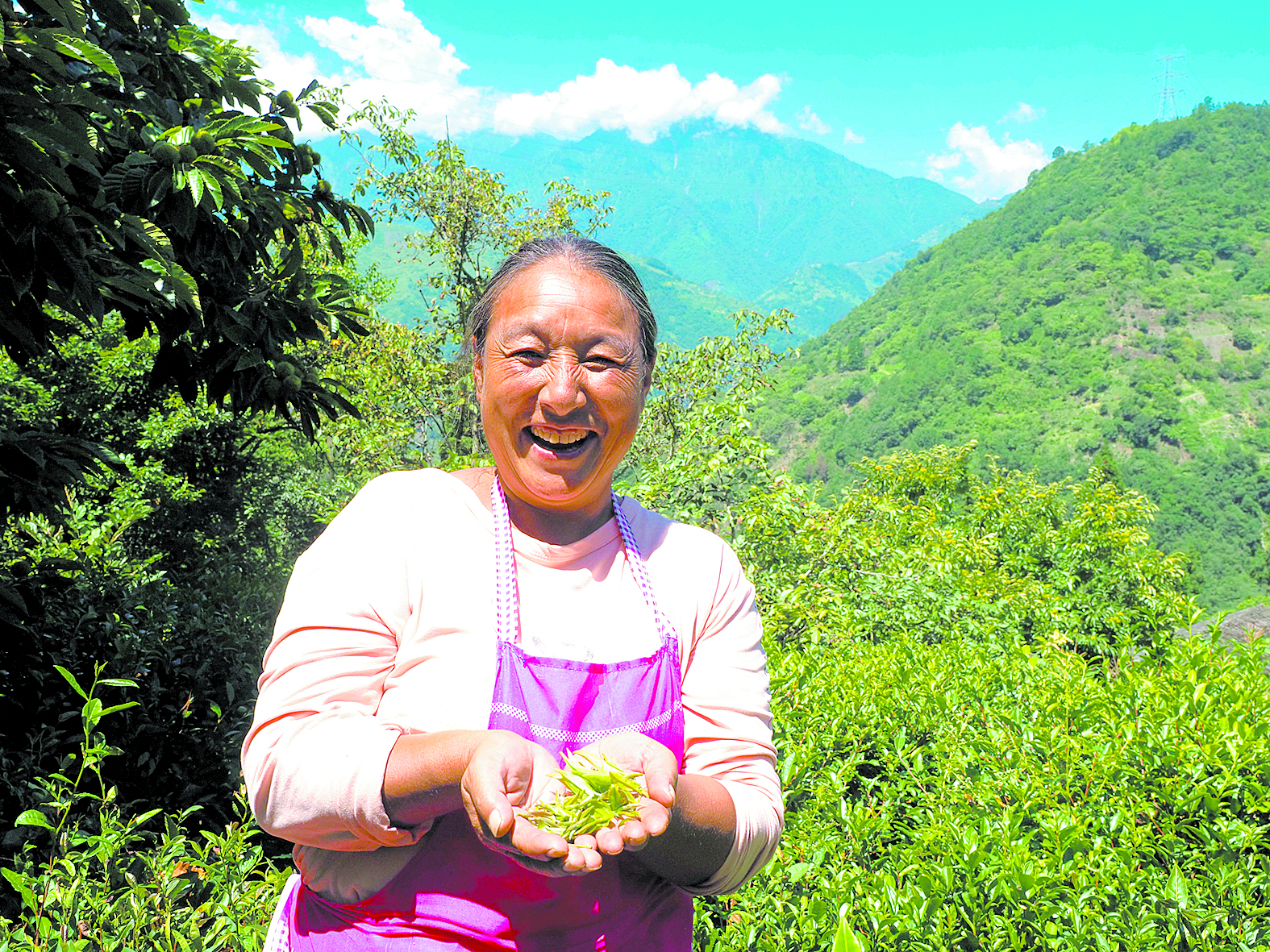 收獲新茶后,紫雅場村村民王美蓉喜笑顏開。于譚陽 攝