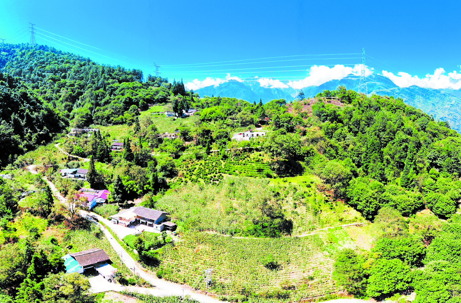 從奔騰的大渡河谷一路向上,海拔1800多米的甘孜州瀘定縣得妥鎮(zhèn)紫雅場村,樹林連綿成片,山頂云霧繚繞,山坡上的茶園反射著陽光,在藍天的映襯下格外青翠。