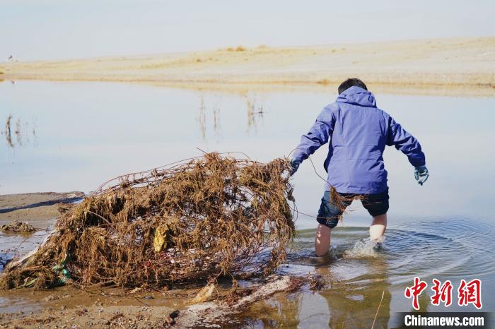 寒風(fēng)凜冽,湖水冰涼,寒徹入骨。十月中旬的青海湖湖濱地區(qū)最低氣溫達(dá)零下二攝氏度,部分河流開始結(jié)冰,青海湖牧民巡護(hù)隊(duì)隊(duì)員尖木措卷起褲腿,邁入冰冷的湖水,徒手將陷入淤泥中的廢棄鐵絲拉上岸。幾分鐘后,尖木措裸露在外的小腿早已凍得通紅。