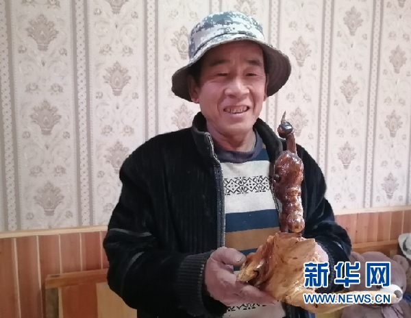 鬧加和他的樹(shù)雕作品。新華網(wǎng) 宋燕 攝