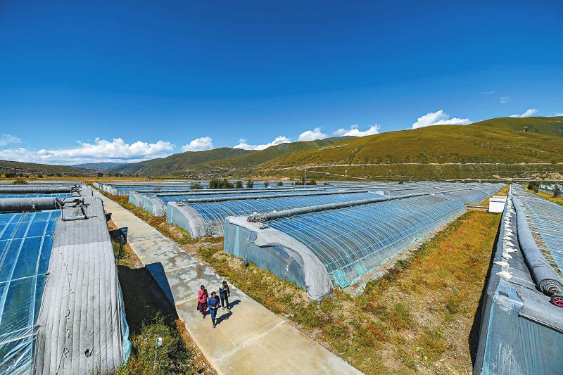 爐霍縣斯木鎮(zhèn)吉絨村飛地產(chǎn)業(yè)園區(qū),按照“土地集中、各村飛地、龍頭經(jīng)營、入股分紅”思路建起的蔬菜大棚基地。四川日?qǐng)?bào) 楊樹 攝