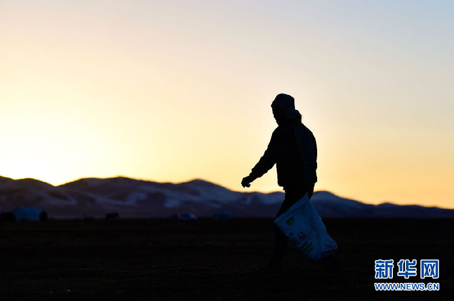 10月28日,在青海省玉樹(shù)藏族自治州稱多縣境內(nèi)的嘉塘草原上,生態(tài)管護(hù)員扎西才文在撿拾垃圾。新華社記者 張龍 攝
