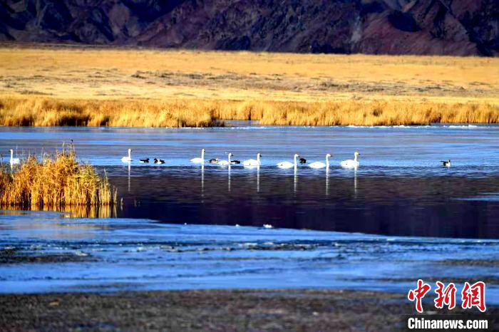 連日來,在都蘭湖國(guó)家濕地公園內(nèi),數(shù)十只大天鵝集中于湖中,或嬉戲游弋,或活動(dòng)覓食,或拍打水面、或振翅欲飛,給冬日的柴達(dá)木盆地增添了無限生趣。同時(shí),與遠(yuǎn)處的雪山、藍(lán)天、白云和湖內(nèi)金黃色蘆葦?shù)挠骋r下,形成一幅五彩繽紛的生態(tài)畫卷。