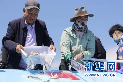 6月6日,當(dāng)?shù)厝罕妼⑶嗪:沲庺~苗投放到布哈河。新華社記者 周喆 攝