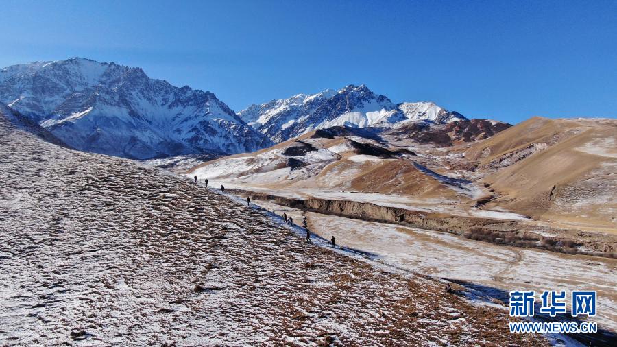 12月8日,祁連山國(guó)家公園扎麻什管護(hù)站生態(tài)管護(hù)員在巡護(hù)途中(無(wú)人機(jī)照片)。新華社記者 張宏祥 攝