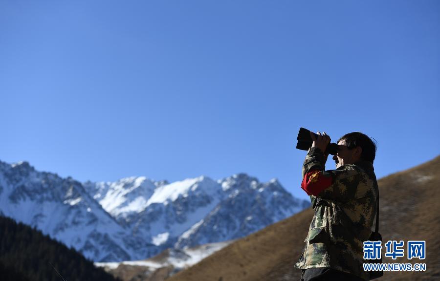 12月8日,祁連山國(guó)家公園扎麻什管護(hù)站生態(tài)管護(hù)員周曲才郎巡查途中使用望遠(yuǎn)鏡。新華社記者 張宏祥 攝