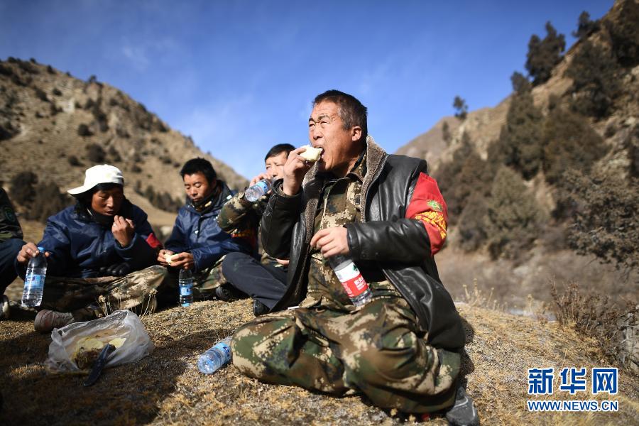 12月8日,祁連山國(guó)家公園扎麻什管護(hù)站生態(tài)管護(hù)員昂毛什加(右一)和同伴在吃午餐。新華社記者 張宏祥 攝