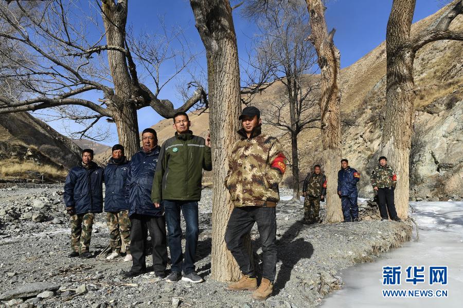 12月8日,祁連山國(guó)家公園扎麻什管護(hù)站工作人員郝生寶、昂旦才讓、索安東周、楊國(guó)林、索安拉什旦、昂毛什加、多杰昂秀、周曲才郎在巡護(hù)途中合影(從左至右)。新華社記者 張宏祥 攝