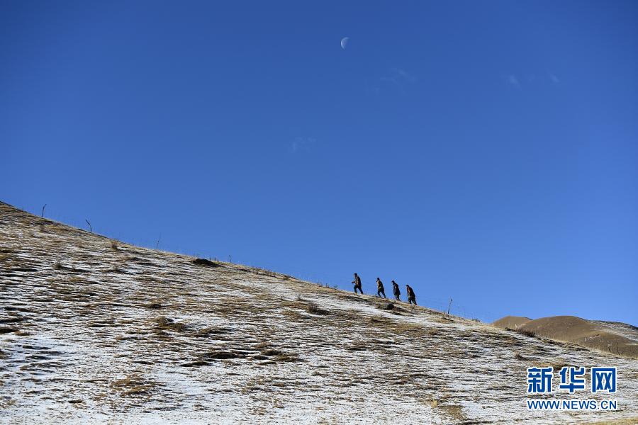 12月8日,祁連山國(guó)家公園扎麻什管護(hù)站生態(tài)管護(hù)員昂旦才讓(右一)和同伴們?cè)谘沧o(hù)途中。新華社記者 張宏祥 攝