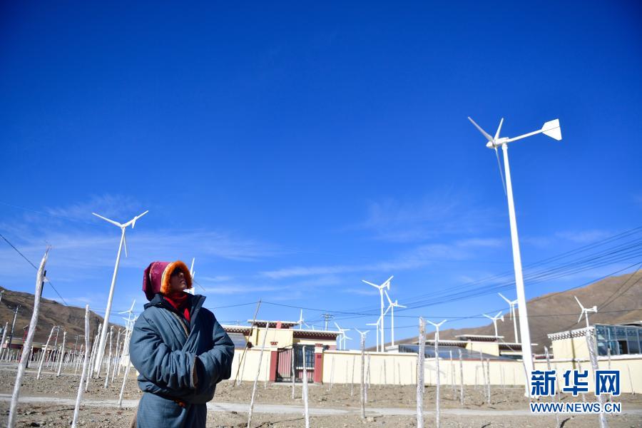 1月11日,隆亞村村支部書記貢保多杰在查看搬遷點的風力發(fā)電機組運行情況。新華社記者 張龍 攝