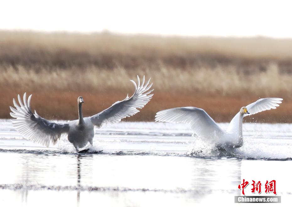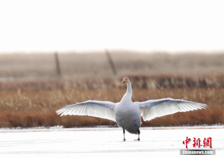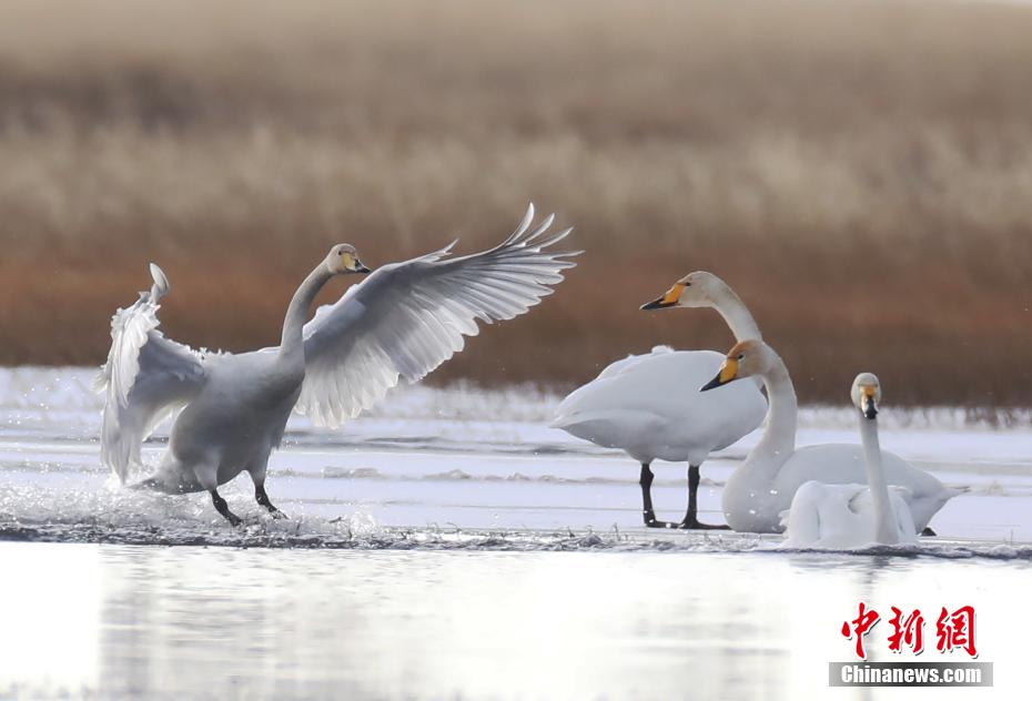 連日來(lái),成群的野生大天鵝陸續(xù)飛臨四川省阿壩藏族羌族自治州若爾蓋縣高原小鎮(zhèn)麥溪鄉(xiāng)的洛賈瓊果河棲息越冬。這些跨越千里來(lái)此越冬的精靈讓洛賈瓊果河充滿了童話色彩,近百只天鵝在偌大的湖面上自由自在地覓食嬉戲,一會(huì)兒在天空翱翔,一會(huì)兒又成群結(jié)隊(duì)地在湖面上追逐,時(shí)而淺吟低唱,時(shí)而引吭高歌,時(shí)而振翅高飛,愜意十足,為冰封雪凍的高原濕地增添了些許靈動(dòng)與生機(jī),成為草原冰雪世界一道靚麗的風(fēng)景。