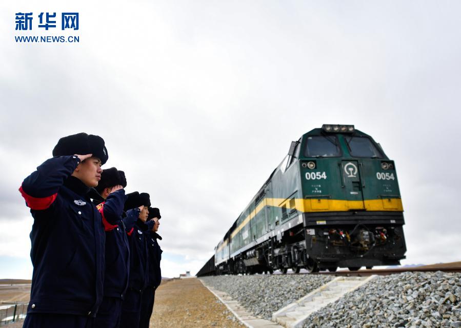 2月4日,沱沱河站派出所巡線民警在巡查途中向行駛列車敬禮。新華社記者 張龍 攝