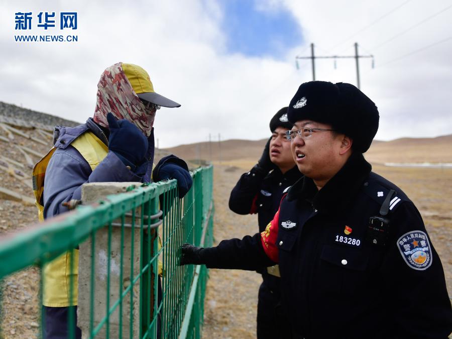 2月4日,沱沱河站派出所巡線民警田長松(右)在巡線途中向青藏鐵路公司格爾木工務段唐古拉線路車間養(yǎng)路工人了解情況。新華社記者 張龍 攝