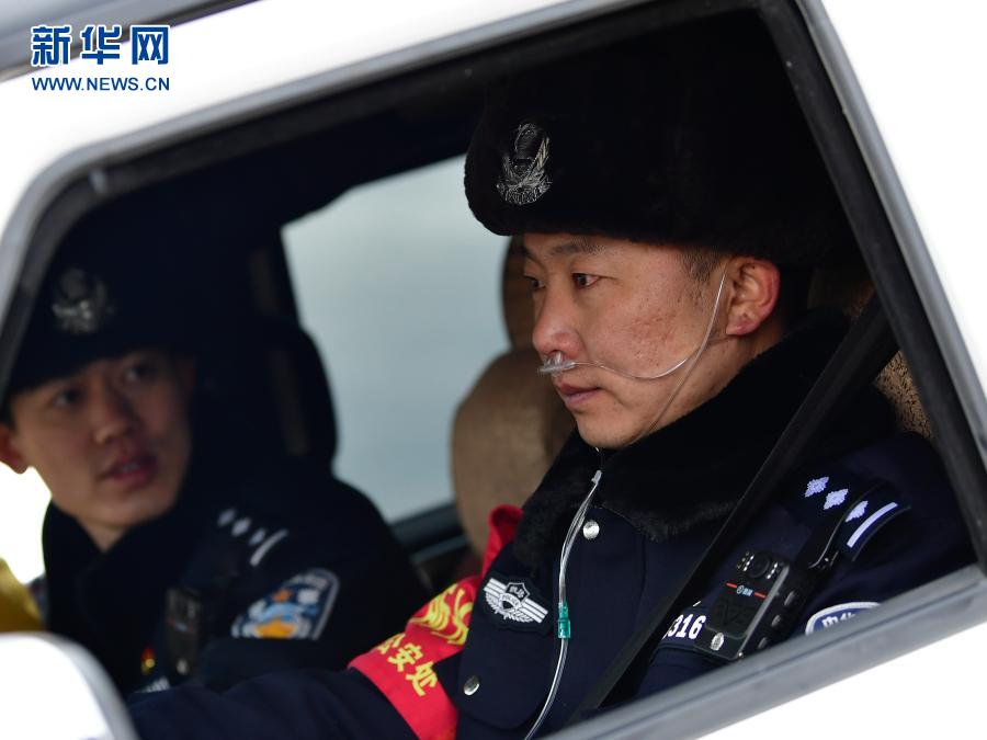 2月5日,沱沱河站派出所副所長蒲海春(右)在巡線途中出現高原反應后緊急吸氧。新華社記者 張龍 攝