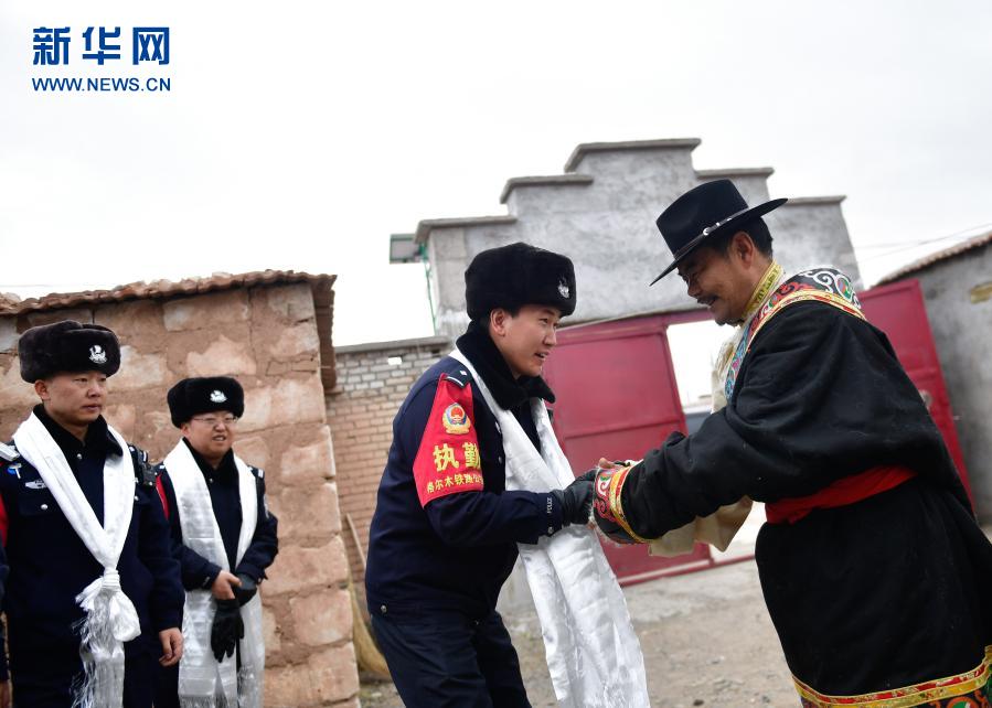 2月5日,沱沱河站派出所巡線民警到格爾木市唐古拉山鎮(zhèn)格日村義務護路隊員革命花(右一)家中慰問時接受哈達。新華社記者 張龍 攝