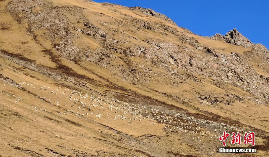 位于青海省南部的三江源區(qū)域,包括長江源(可可西里)、黃河源、瀾滄江源,是青藏高原生態(tài)系統(tǒng)的典型代表,分布雪豹、藏羚羊、野牦牛、黑頸鶴等珍稀物種,被稱“高原野生動物王國”、“高寒生物種質資源庫”。圖為巖羊群。曲麻萊管理處 供圖