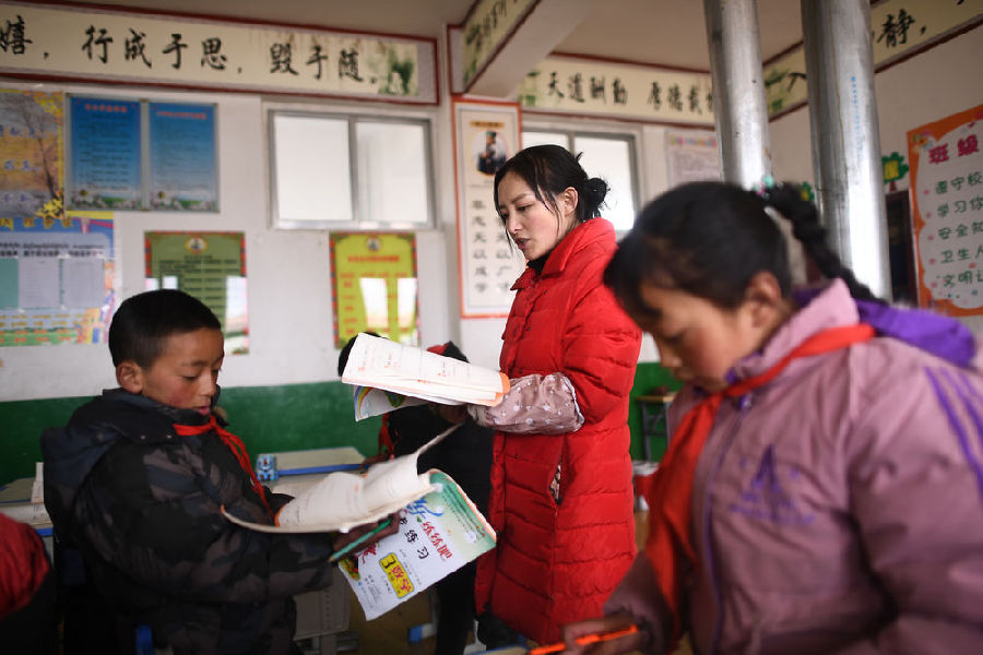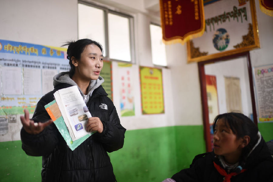 3月16日,索加鄉(xiāng)寄宿小學(xué)藏語(yǔ)文老師白瑪在為學(xué)生授課。新華社記者 韓方方 攝