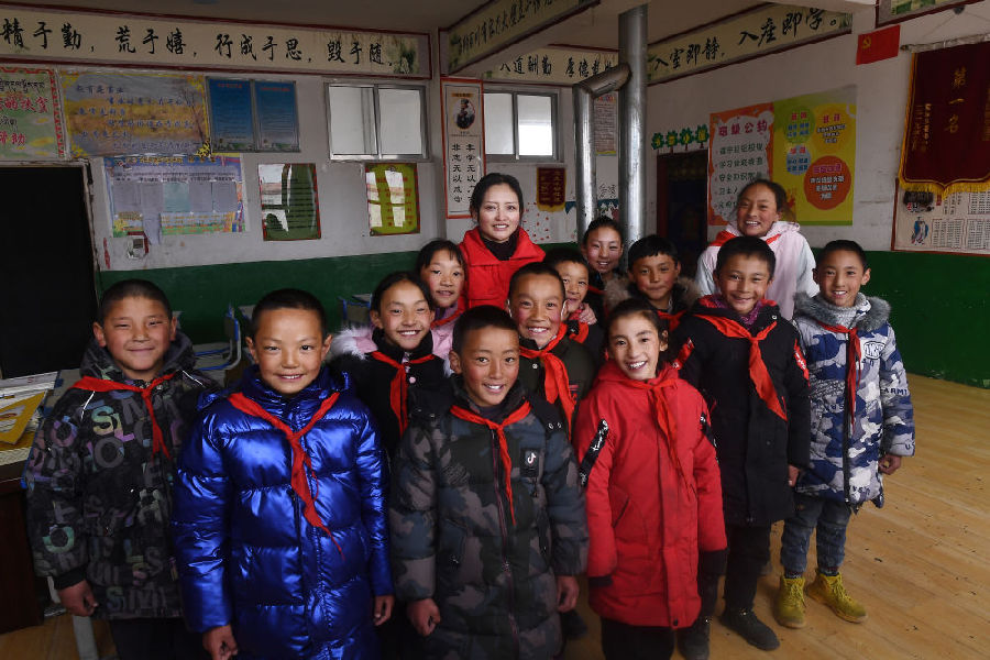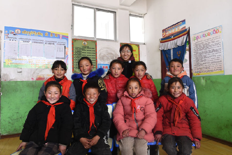 3月16日,在索加鄉(xiāng)寄宿小學(xué),查日老師(后排中)和學(xué)生在一起。新華社記者 駱曉飛 攝