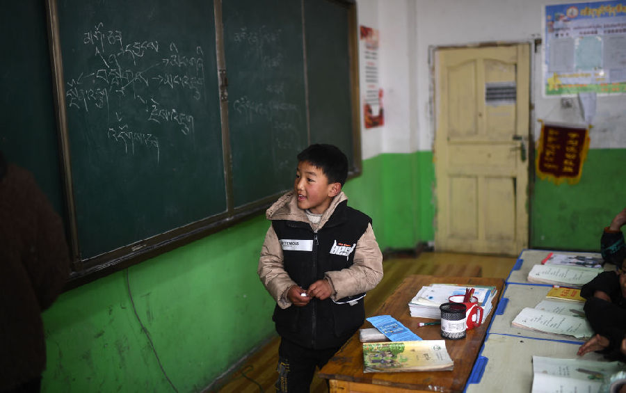 3月16日,索加鄉(xiāng)寄宿小學(xué)語(yǔ)文老師查日在為學(xué)生上課。新華社記者 張宏祥 攝