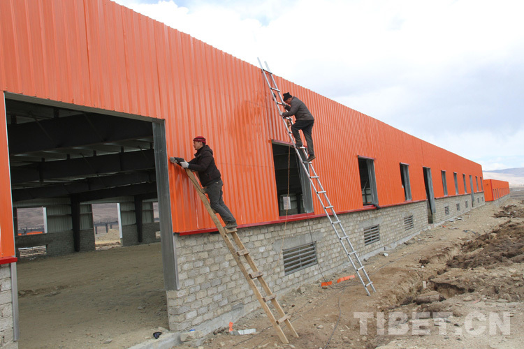 圖為工人給鋼構牛棚墻瓦打螺絲