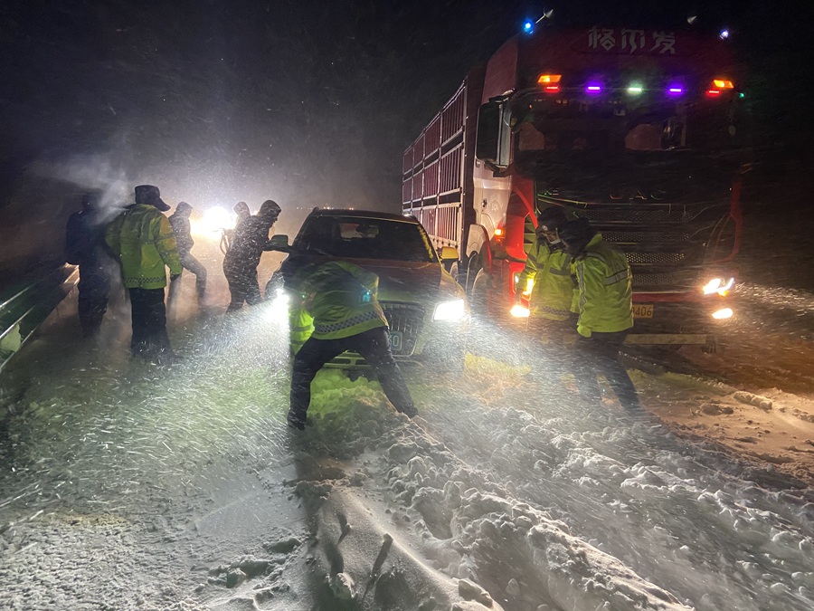 在這次緩堵保暢工作中,瑪多縣公安局交警大隊(duì)副隊(duì)長李西帶領(lǐng)大隊(duì)所有民警、輔警趕到現(xiàn)場(chǎng)處理滯留車輛。由于這一路段為長大坡道、急彎路段,加之大風(fēng)將雪吹至路面,導(dǎo)致有60余輛車滯留。當(dāng)時(shí)最低氣溫為零下10℃,在海拔高度4542米的惡劣環(huán)境下,工作人員用凍僵的雙手為被困群眾保駕護(hù)航。