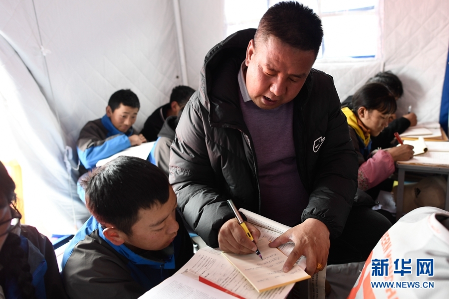 5月23日,瑪多縣民族寄宿制中學(xué)九年級(jí)老師李加才仁在課堂上輔導(dǎo)學(xué)生。新華社記者 張龍 攝
