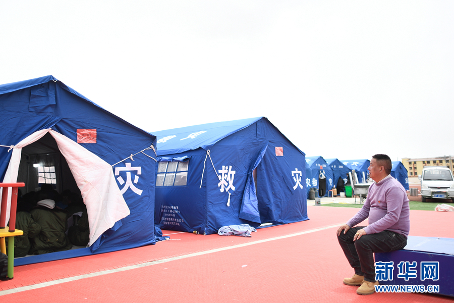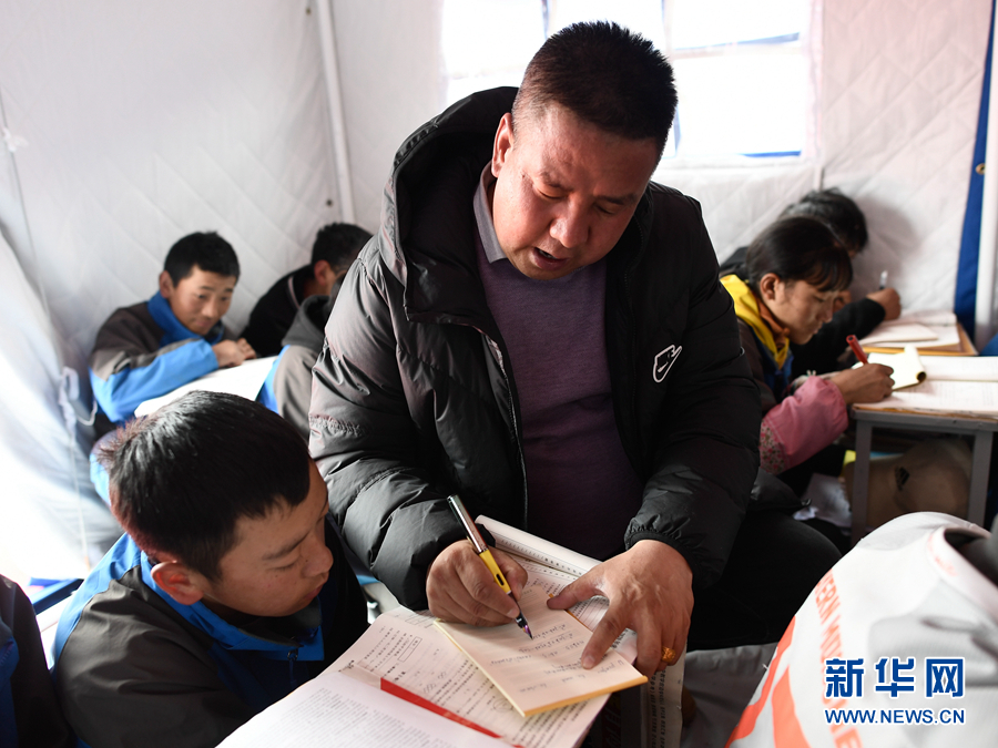 5月23日,李加才讓在帳篷教室里給學生輔導功課。新華社記者 張龍 攝