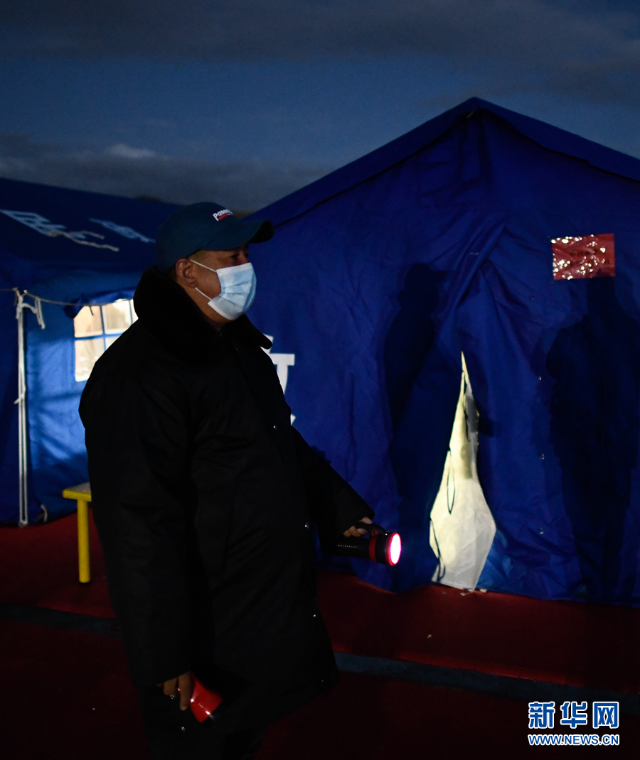 5月23日夜間,李加才讓在瑪多縣民族寄宿制中學操場的學生營地巡查。新華社記者 張龍 攝