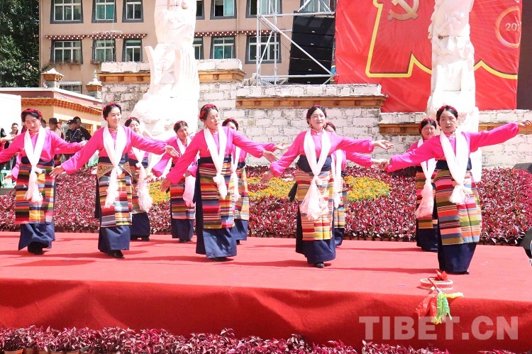 活動現場,黨旗國旗飄揚、哈達傳情,在一片歡騰的海洋里,大家載歌載舞齊唱光輝歲月,放聲歌頌幸福美好生活,盡情抒發(fā)高城兒女的愛黨愛國情懷。歌曲《翻身農奴把歌唱》《草原上升起不落的太陽》,穿插吉祥老人頌詞和舞蹈。表達高原兒女在中國共產黨的領導下,翻身獲得解放,掌握了自己的命運。短短幾十年的發(fā)展過程,涉藏州縣迎來騰飛,經濟社會發(fā)生了翻天覆地的變化,與祖國同步實現全面小康。
