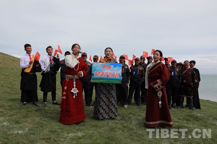 圖為扎陵湖畔青海牧民生態(tài)管護(hù)員方隊在歌唱 攝影:才仁當(dāng)智