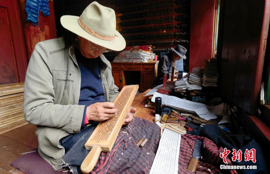 7月20日,四川德格,印經(jīng)院藏族雕版印刷非遺傳承人校對木刻版。中新社記者 劉忠俊 攝