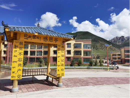群山連綿、江河蜿蜒,雜花生樹、綠草如茵,距離縣城3公里,“牧人希望家園”靜靜矗立在瀾滄江源頭。走進(jìn)大門,小區(qū)內(nèi)寬敞的廣場,配套設(shè)施齊全,刻著“感恩”紅色大字的石頭擺放在中央,還專門設(shè)有“感恩亭”,老人孩童,坐在一排排白墻紅瓦藏式風(fēng)格濃郁的三層小樓臺階上納涼,一派歡樂祥和景象。這里是海拔4200米青海玉樹藏族自治州雜多縣的一個易地扶貧搬遷安置點(diǎn)。我們今天走訪的對象是蘇魯鄉(xiāng)山榮村的東尕和巴宗。