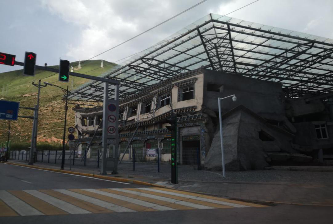沿著214國道駛?cè)肭嗪J∮駱渲萦駱涫校诘谝粋€路口闖入眼簾的是一座在地震中損毀的房子——這就是3層樓高、擁有71間客房的格薩爾王賓館,它被保留下來作為對十年前那場災(zāi)難的紀(jì)念。